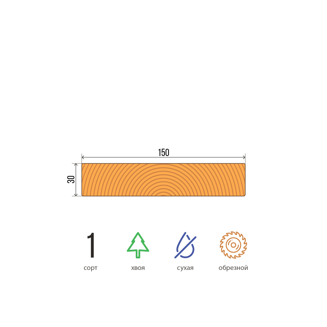 Доска обрезная 30х150х6000 сухая хвоя Сорт 1